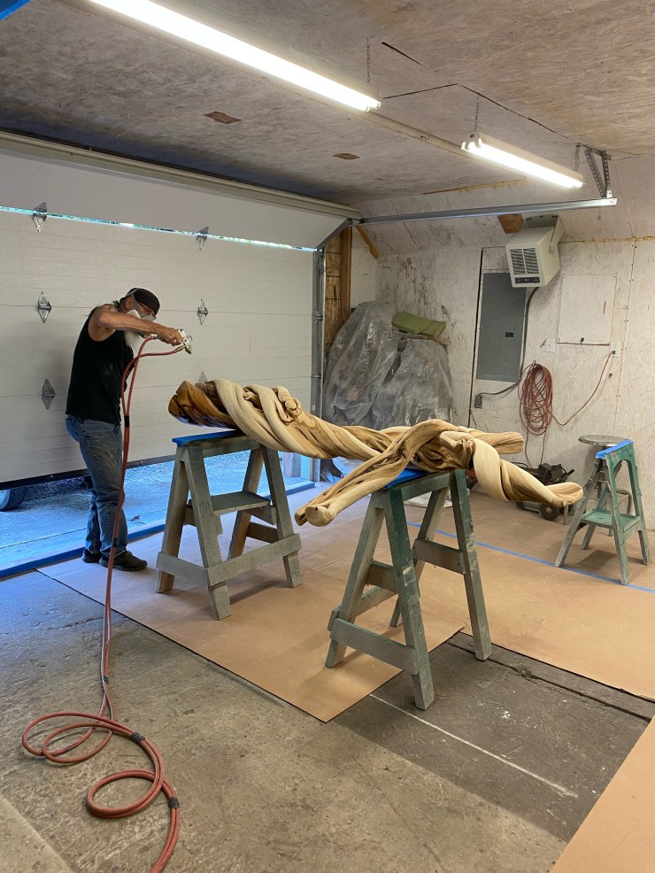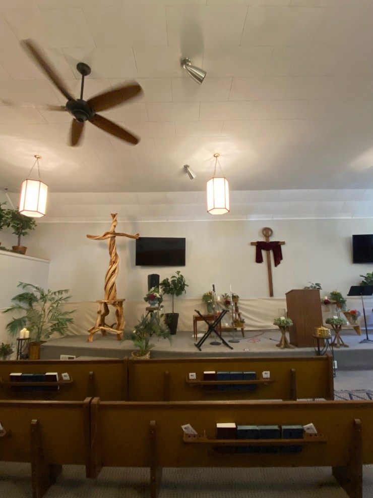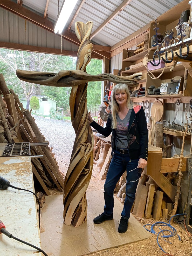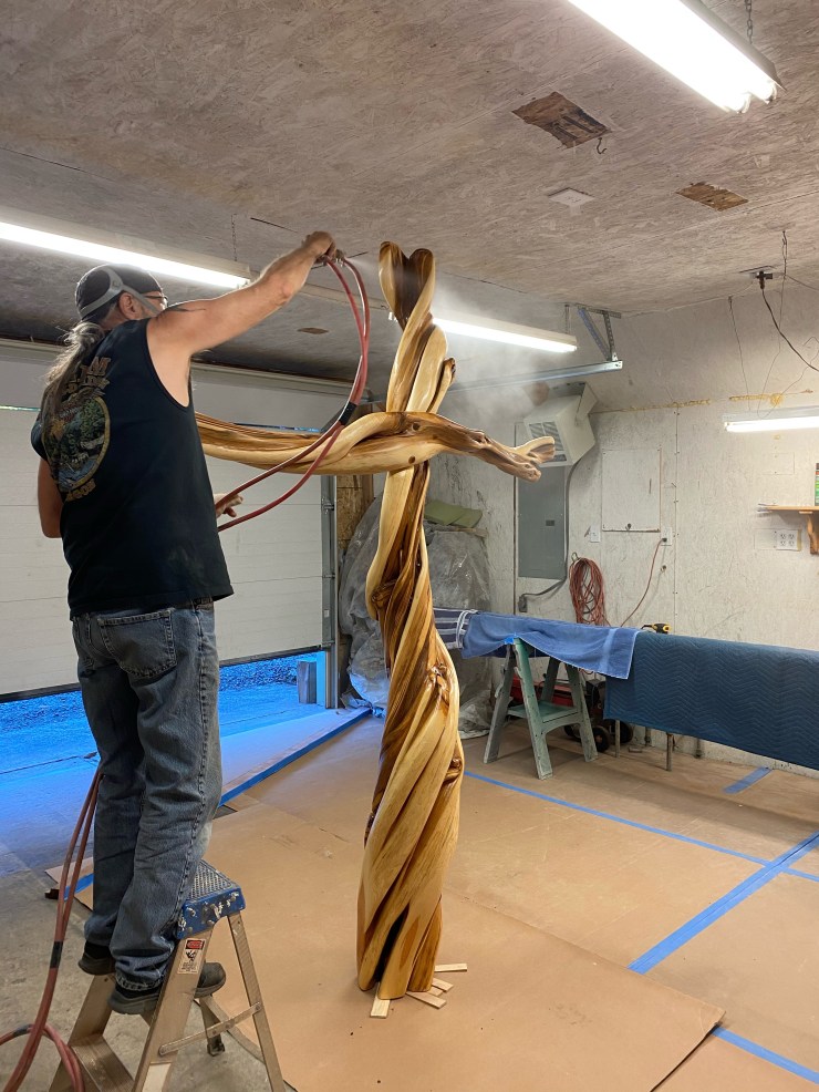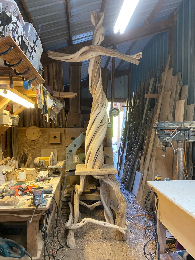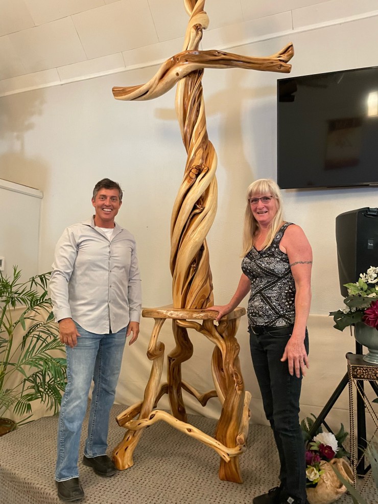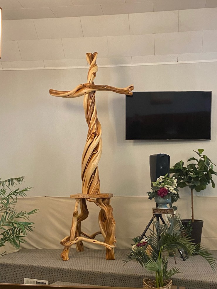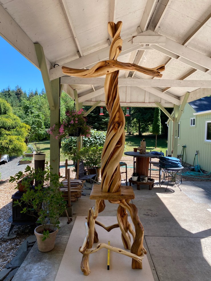 The BEST project I have EVER completed…A Cross for the Carver Church….They asked me to build a new Cross to replace their existing Cross…I humbly and gratefully said yes, found a perfect 8′ piece of Juniper and here are pictures of the Cross in it’s creation, my husband, Doug, lacquering it and the finished Cross in it’s new home…I am standing with Seth Lewis, the wonderful Pastor of the Carver Church.