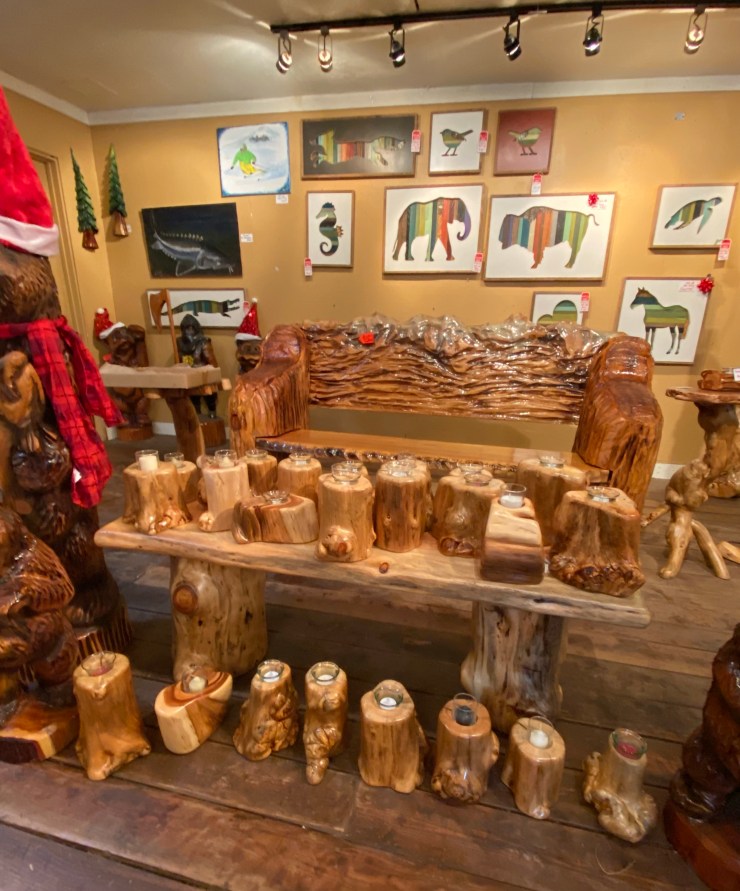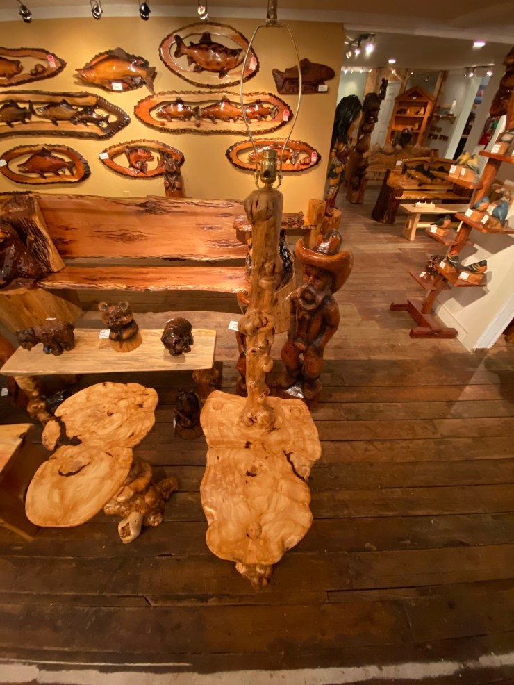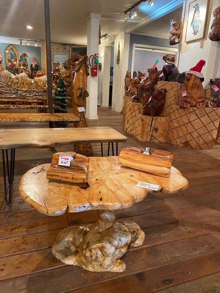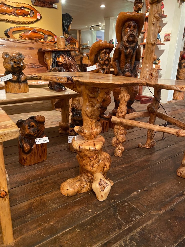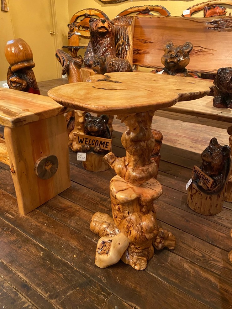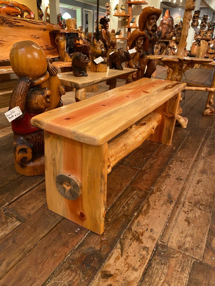 Here is the Burly Pine Bench and Accent Table up at The Gallery at Alder Creek next to some cute Gnomes, Sasquatches and Bears….so excited that the Bench and Table have already sold!👍😃