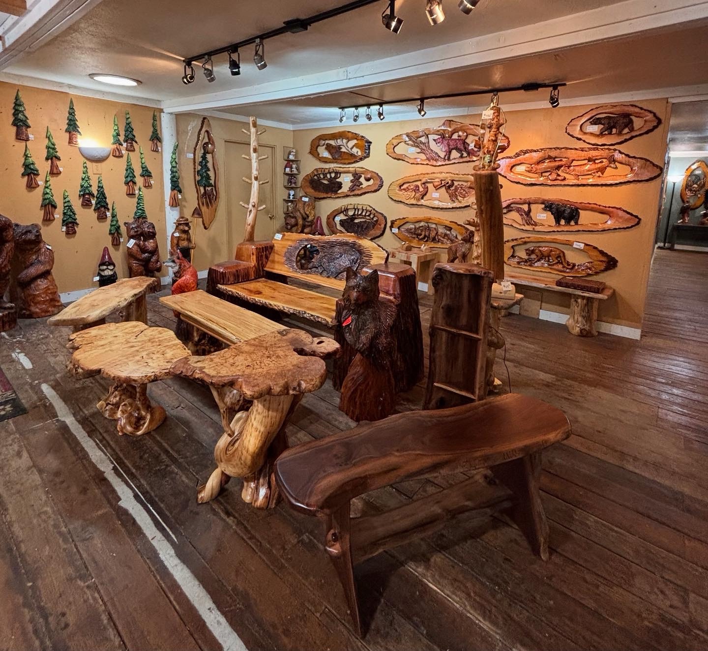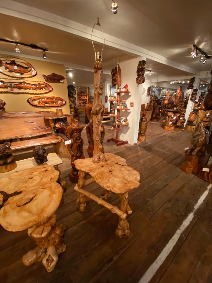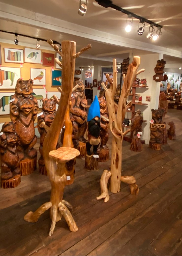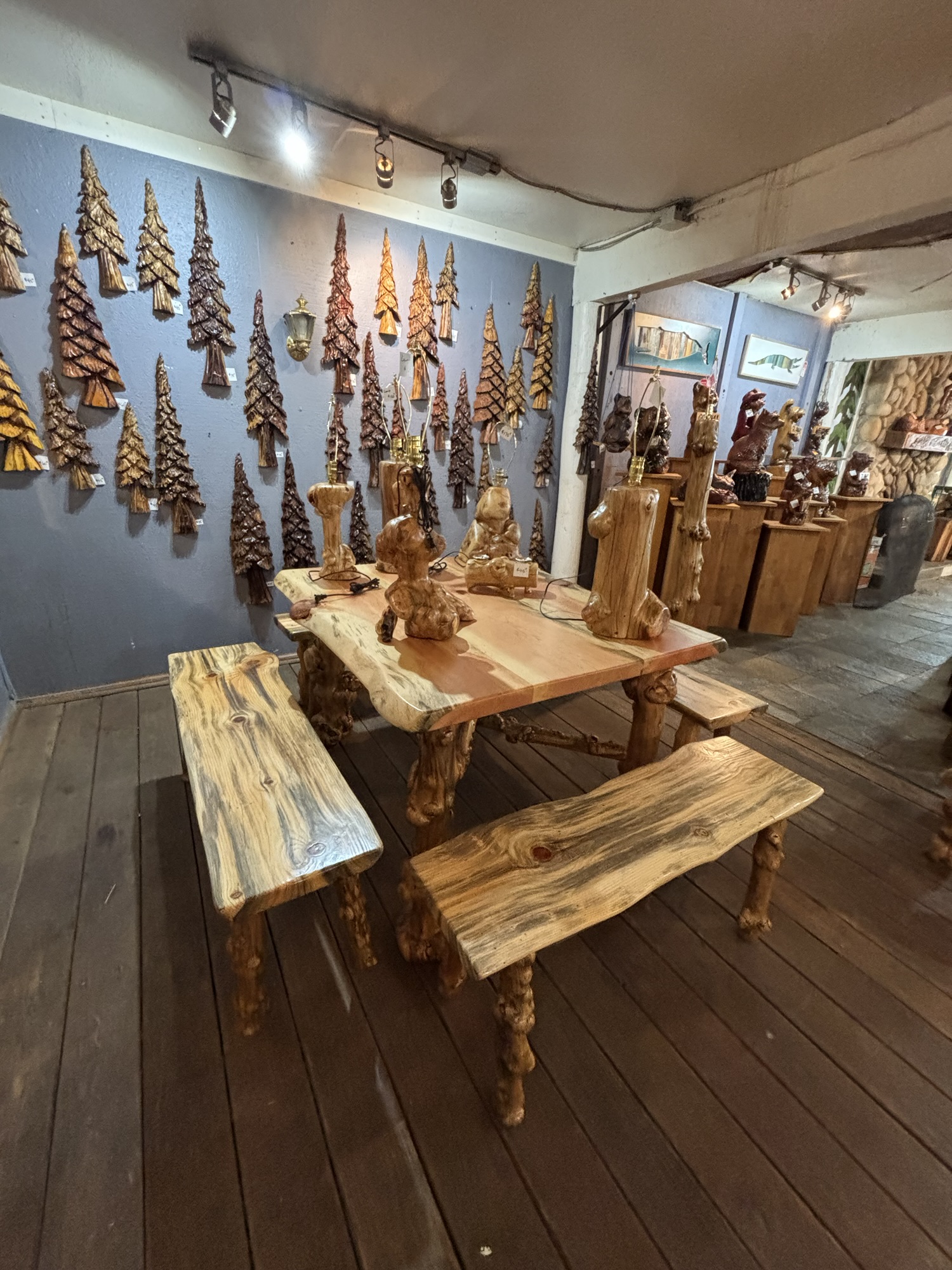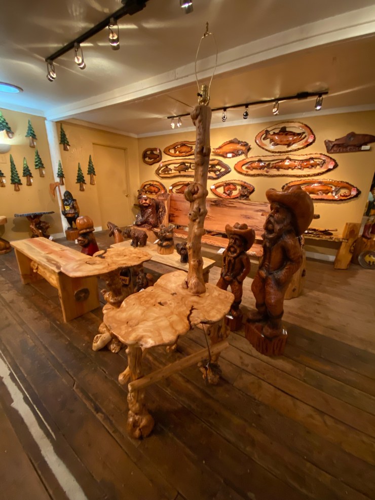Here is the Burly Pine Bench and Accent Table up at The Gallery at Alder Creek next to some cute Gnomes, Sasquatches and Bears….so excited that the Bench and Table have already sold!👍😃