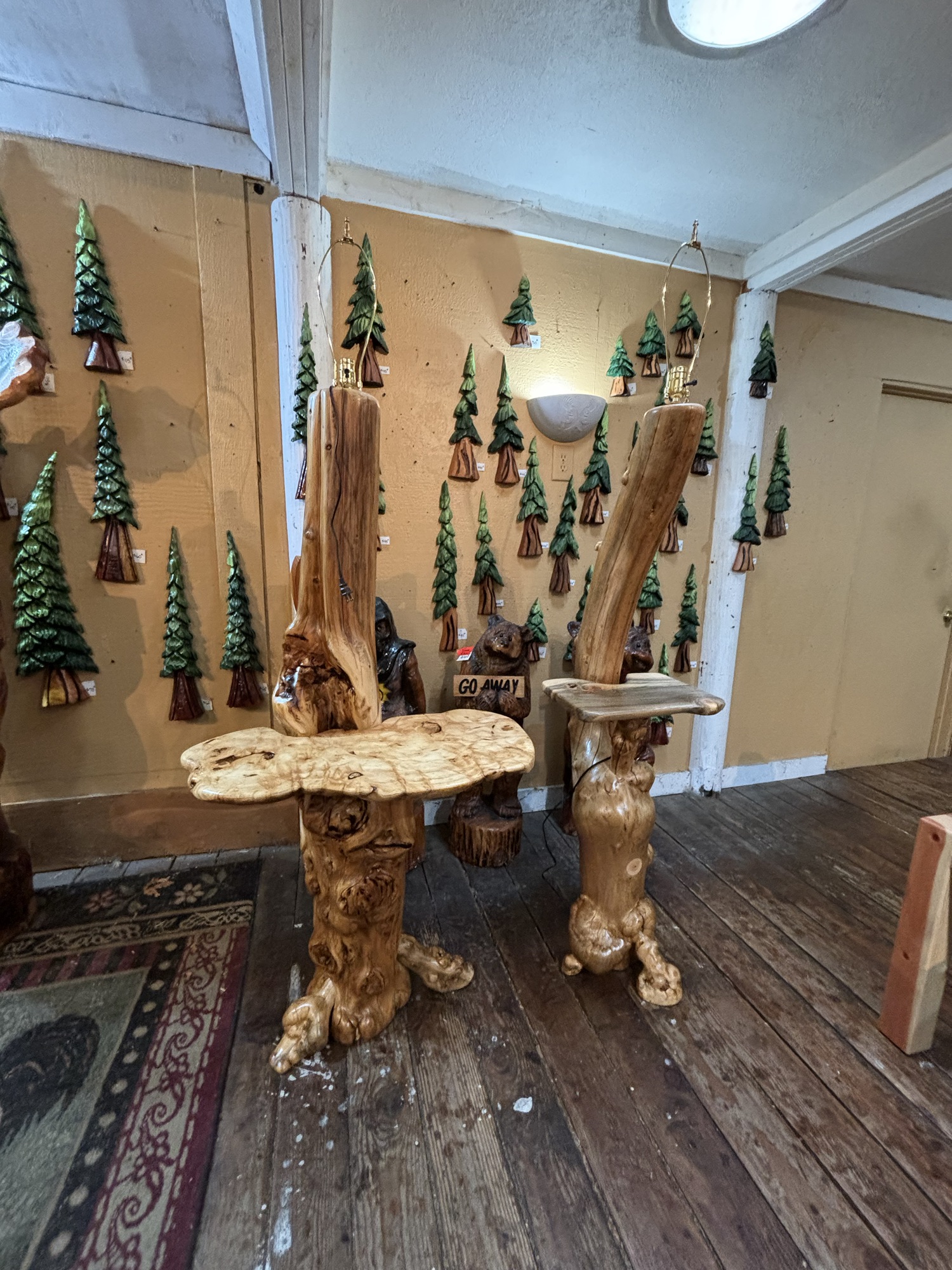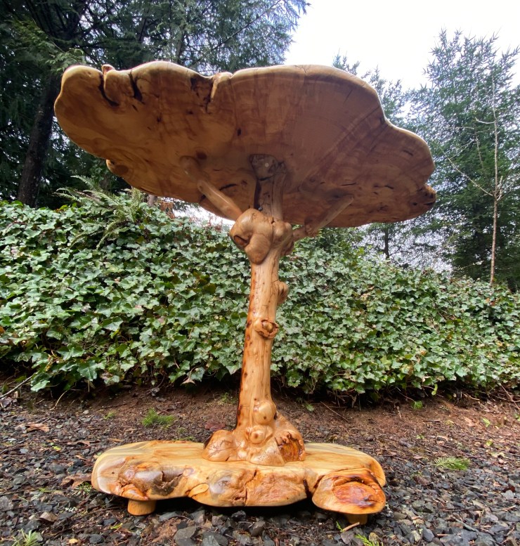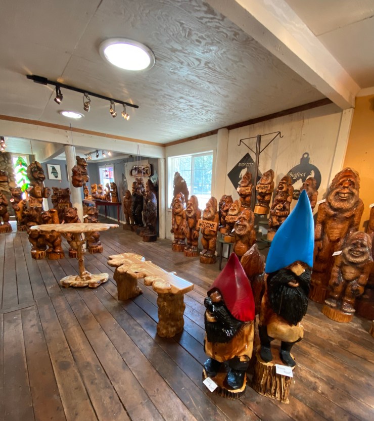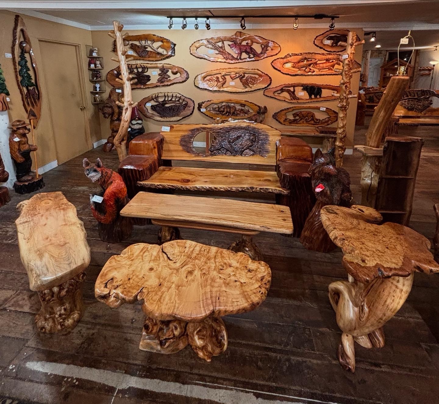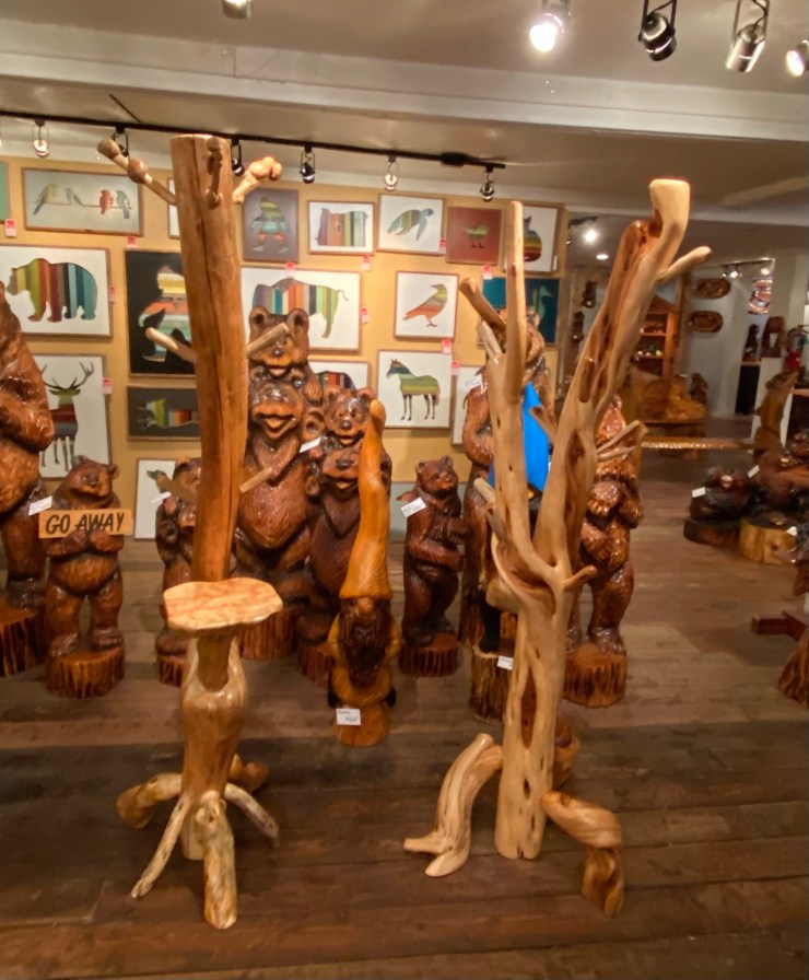 Here is the Burly Pine Bench and Accent Table up at The Gallery at Alder Creek next to some cute Gnomes, Sasquatches and Bears….so excited that the Bench and Table have already sold!👍😃